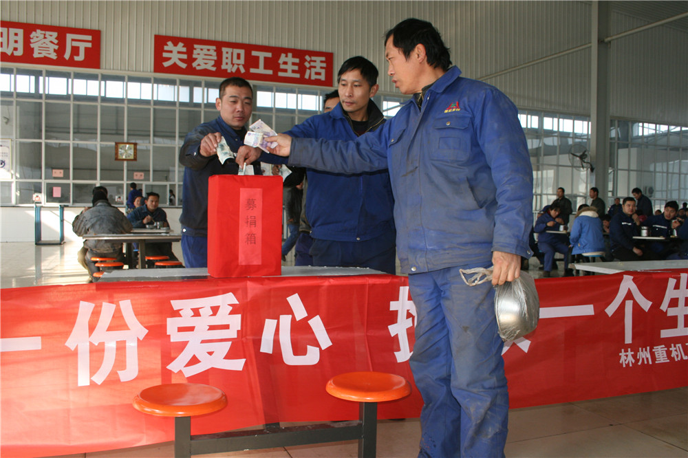 11日上午,公司工會立即發出募捐倡議書。下午二點在公司辦公樓前舉行了募捐儀式并現場募集。公司總經理郭釧代表公司捐款10000元,公司董事韓錄云代表其家人捐款10000元,其他公司領導及機關部室、分子公司管理人員紛紛捐款,特別是與郭保紅素不相識、在我公司施工的深圳市朗奧潔凈科技股份有限公司捐款3000元,河南派普建工集團有限公司捐款1000元,供應商延津縣熱處理廠張東福看到募捐活動也捐款500元,短短不到半個小時募集捐款近4萬元。更值得一提的是原林州重機集團員工張國華,也是腎病患者,曾經得到過林州重機捐款資助的他看到朋友圈的消息后,也委托朋友捐款10元,他說:我也是一名尿毒癥患者,我也曾經得到過林州重機的捐助,現在我雖然還在治療之中,但我也要盡我一點心意。多么樸實的話語,多么善良的員工,一方有難八方支援,真正體現出了我們林州重機是一個互助友愛的大家庭。12日中午,公司工會又在職工食堂舉行第二次募捐活動,累計募捐善款 42337元。